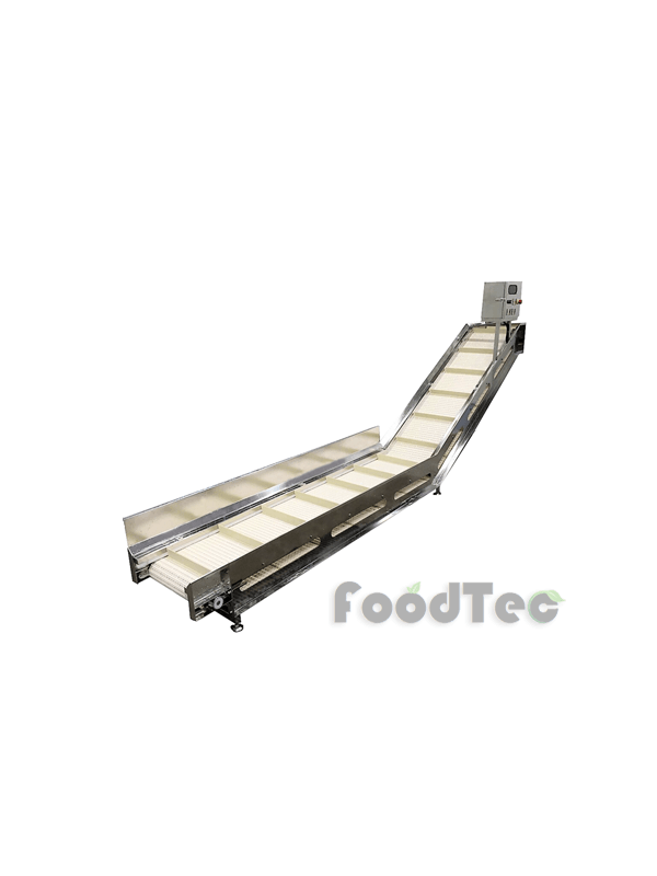 This machine is a gooseneck-type height conveyor is directly connected to the front end of all washing machines. Cutting and processing machines can be configured on both sides. A spray pipe can be configured above the height conveyor for initial cleaning. Conveyor speed is adjustable by the frequency converter. It is efficient and can replace lots of labor.