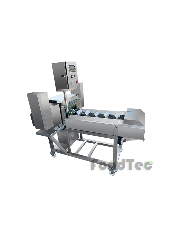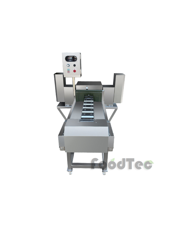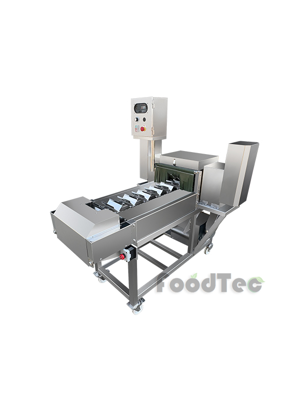Waste and finished products are discharged through separate inclined chutes, preventing cross-contamination and complying with food safety requirements. The knife roller speed and conveyor speed can be synchronously adjusted via an inverter, thereby improving processing efficiency. At the feeding section, emergency stop buttons are installed on both the left and right sides, along with protective covers and safety curtains to enhance operational safety. During machine operation, the emergency stop buttons can be pressed to immediately stop the machine.